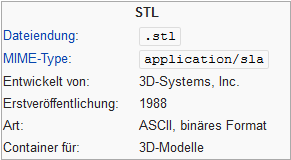 STL-Schnittstelle Die STL-Schnittstelle (STereoLithography) ist eine Standardschnittstelle vieler CAD-Systeme. Sie stellt geometrische Informationen dreidimensionaler Datenmodelle bereit für die Fertigung mittels generativer Fertigungsverfahren oder „Rapid Prototyping“-Anlagen.![]() (Quelle: Wikipedia) | ||