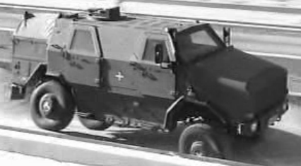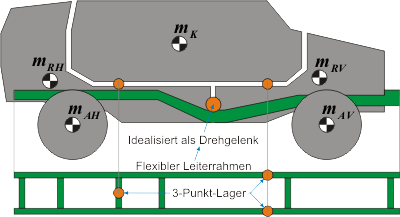 Das im Video gezeigte Fahrzeugmodell ist ein nichtlineares Zweispurmodell (12 Freiheitsgrade, Systemordnung 83), das zusammen mit einem nichtlinearen und einem linearen Einspurmodell innerhalb des Sonderforschungsbereichs "Massive Parallelität" (SFB 376) im Rahmen des "Kreuzungsmanagements" (Teilprojekt C1) über mehrere Jahre hinweg entwickelt und modifiziert wurde. Die letzten Modifikationen erfolgten durch Dr. Bruns für eine Optimierung der Fahrdynamik [3] und eine Verwendung innerhalb eines Kolonnenreglers [4]. | ||