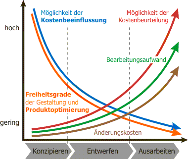 | „Der Konstrukteur hat mit 60 bis 80 % der Kostenfestlegung eines Produktes eine hohe Kostenverantwortung im Unternehmen. Gerade die Phase des Konzipierens bietet die größten Möglichkeiten zur Kostenbeeinflussung. Es ist völlig sinnlos, erst im Nachhinein die Kosten zusammenzurechnen, wenn das Produkt schon gefertigt ist. Denn je weiter der Konstruktionsprozess fortgeschritten ist, desto geringer sind die Möglichkeiten, die Kosten zu beeinflussen. Notwendig ist eine Kostenfrüherkennung. Ein kurzer Regelkreis zwischen Konstruktion, Arbeitsvorbereitung und Kalkulation ist die Voraussetzung, um kostengünstig zu konstruieren.“ Erasmus Bode: Konstruktionsatlas, 1996 | ||