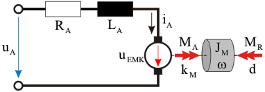 ![]() ![]() | Ersatzschaltbild ![]() Differentialgleichungen \[{u_A} = {R_A} \cdot {i_A} + {L_A} \cdot \frac{{d{i_A}}}{{dt}} + {u_{EMK}},\;\;\;\;u_{EMK}=k_M \cdot \omega\] \[{J_M} \cdot \dot \omega = {M_A} - {M_R} = {k_M} \cdot {i_A} - d \cdot \omega \] Zustandsraumdarstellung \[\left[ {\begin{array}{*{20}{c}} {\frac{{d{i_A}}}{{dt}}}\\ {\dot \omega } \end{array}} \right] = \left[ {\begin{array}{*{20}{c}} { - \frac{{{R_A}}}{{{L_A}}}}&{ - \frac{{{k_M}}}{{{L_A}}}}\\ {\frac{{{k_M}}}{{{J_M}}}}&{ - \frac{d}{{{J_M}}}} \end{array}} \right] \cdot \left[ {\begin{array}{*{20}{c}} {{i_A}}\\ \omega \end{array}} \right] + \left[ {\begin{array}{*{20}{c}} {\frac{1}{{{L_A}}}}\\ 0 \end{array}} \right] \cdot {u_A}\] System- bzw. Zustandsgrößen