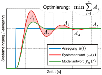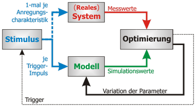 Die generelle Systematik dieser Optimierung (Video 1) entspricht derjenigen, die beim obigen Beispiel des Einmassenschwingers bereits beschrieben wurde: Das reale System wurde mit einem Spannungssprung angeregt, parallel wurde die (verrauschte) Systemantwort gemessen. Das mathematische Modell wird im Rahmen einer Simulation mit derselben Anregung stimuliert, und die Modell-Parameter werden solange variiert, bis eine bestmögliche Übereinstimmung von gemessener Systemantwort und simulierter Modellantwort erzielt wird.