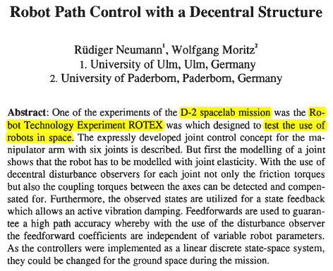 [6] | Neumann, Rüdiger; Moritz, Wolfgang: Gelenkregelung des ROTEX-Roboters bei der D-2 Spacelab-Mission. GMA Fachtagung Intelligente Steuerung und Regelung von Robotern, Langen, 1993 | |